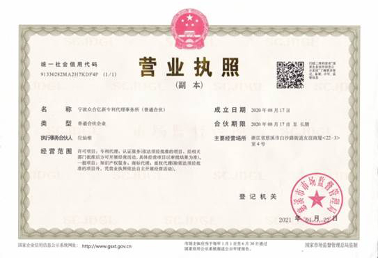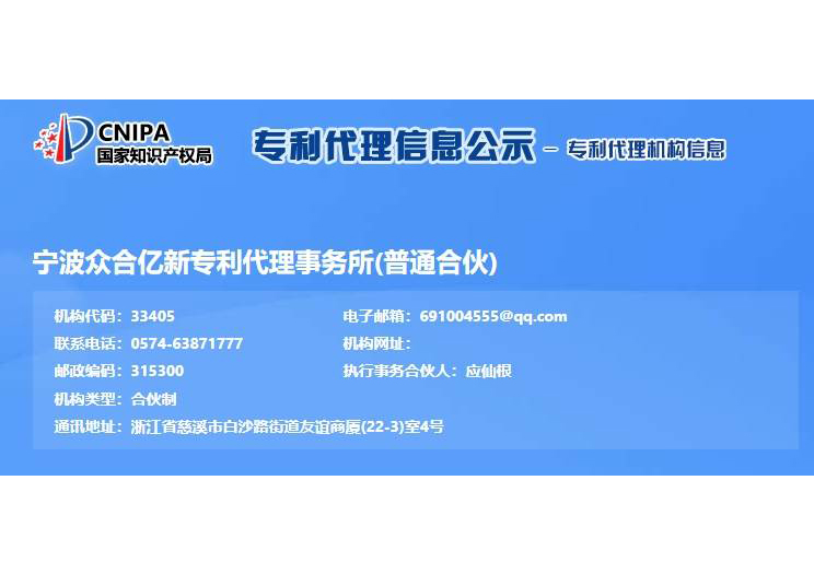 浙江億新知識產權服務有限公司前身為慈溪眾合知識產權代理事務所,創(chuàng)始于2004年,為了服務更多的創(chuàng)新企業,實現“服務億萬創(chuàng)新企業”的理念,后更名為浙江億新知識產權,旗下公司包括:寧波眾合億新專利代理事務所(機構代碼33405)、中范(北京)認證有限公司。其中寧波眾合億新專利代理事務所是慈溪市科技服務聯盟理事單位,前灣區知識產權工作站。公司位于浙江省慈溪市文化商務區友誼商廈,并在北京、青島設有辦事處。
